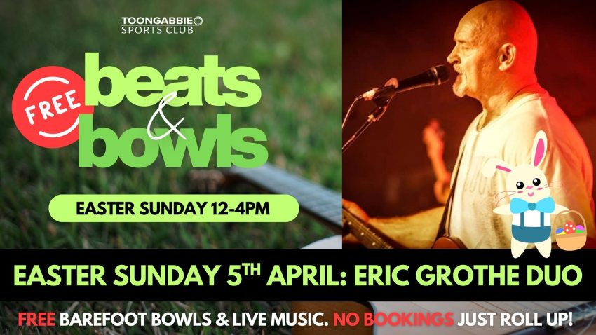 Join us from 12pm – 4.00pm Easter Sunday for FREE Barefoot Bowls and FREE Live Music on the greens with the Eric Grothe Duo.